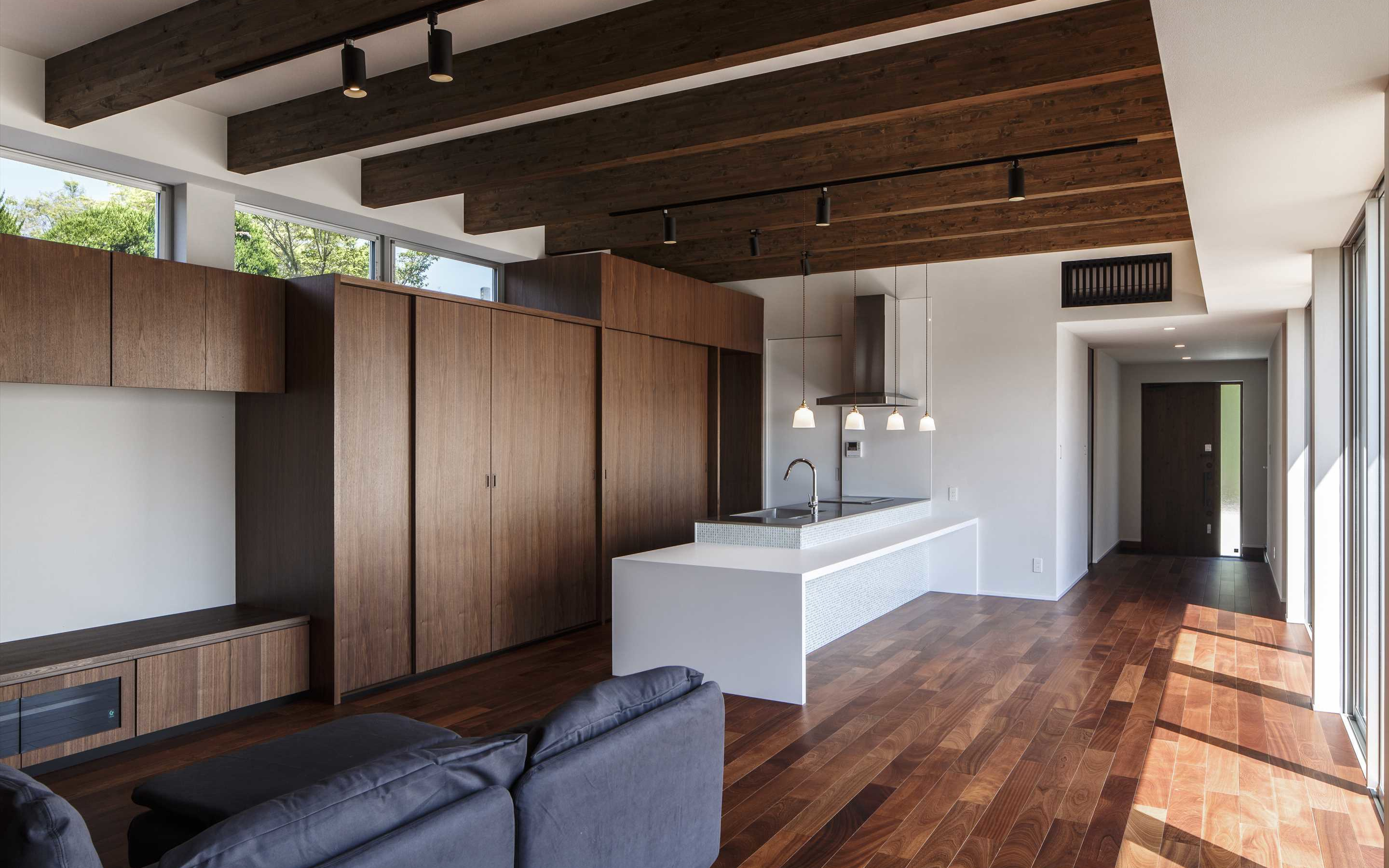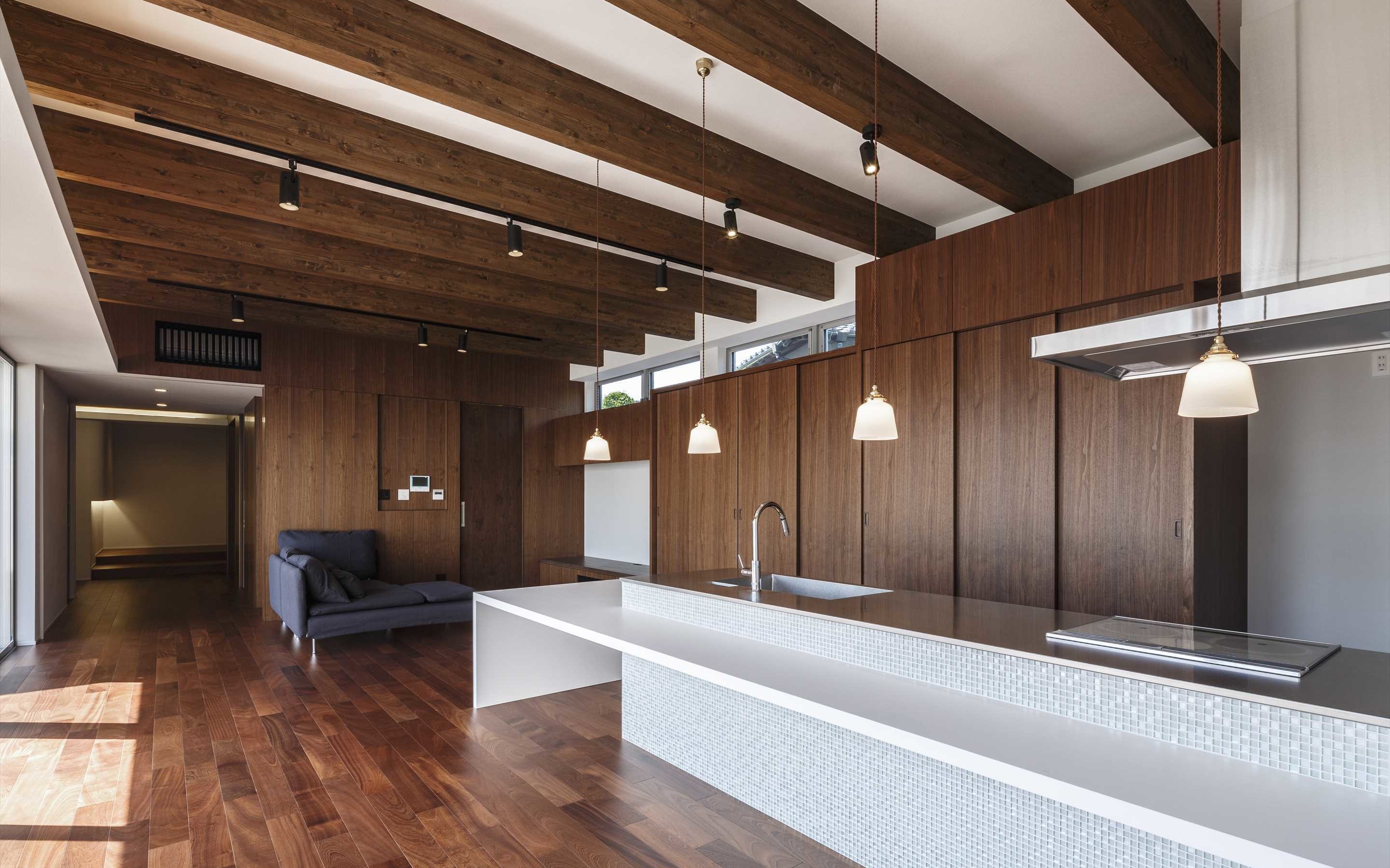 幅広廊下を介して無駄なく回遊できる生活動線も確保され機能性に優れています。また、全体に繊細な印象をつくり出しており、素材へのこだわりが光ります。