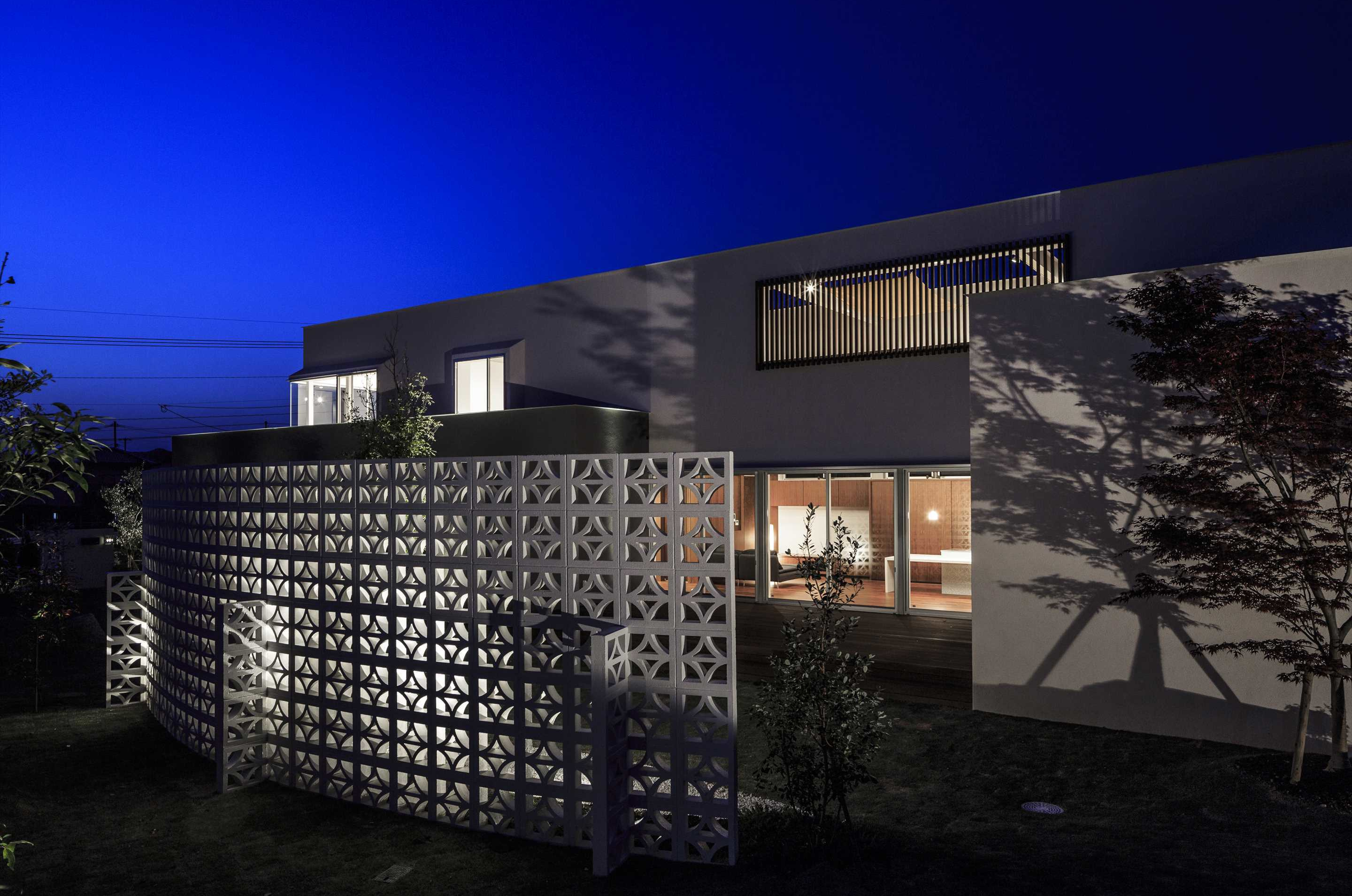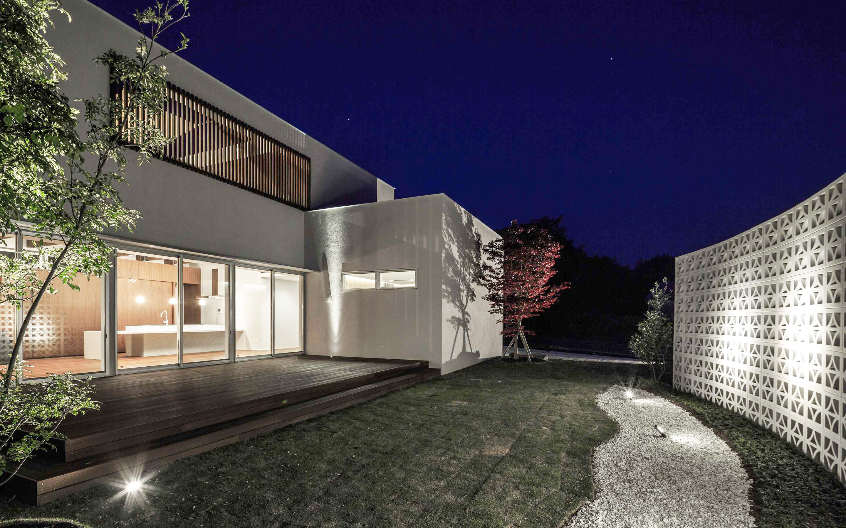 リビングに繋がる庭園は広いデッキとフラットで繋がり、広がりと開放感を演出します。高い琉球ブロックが外からの視線を遮ることでプライバシーが守られています。
