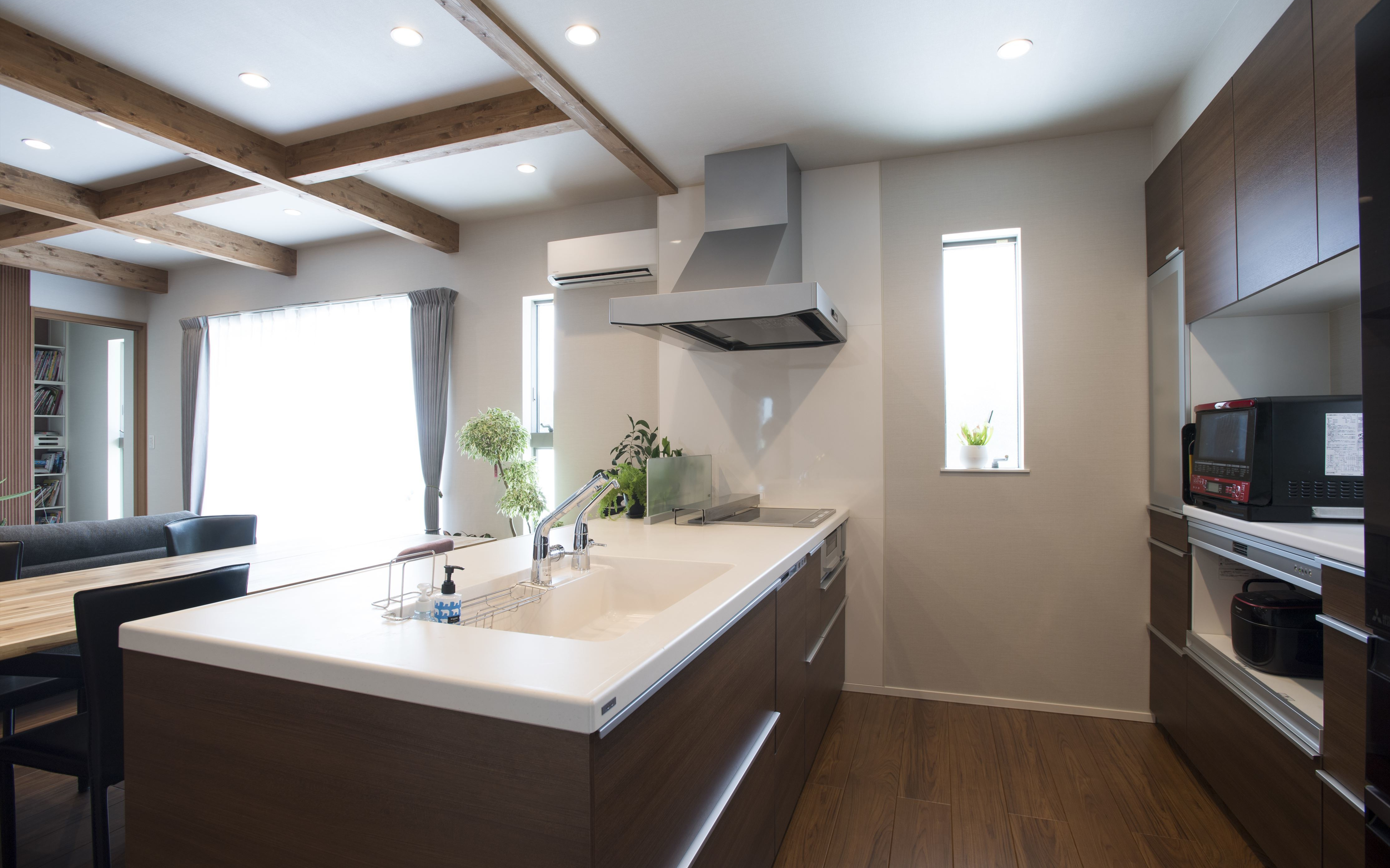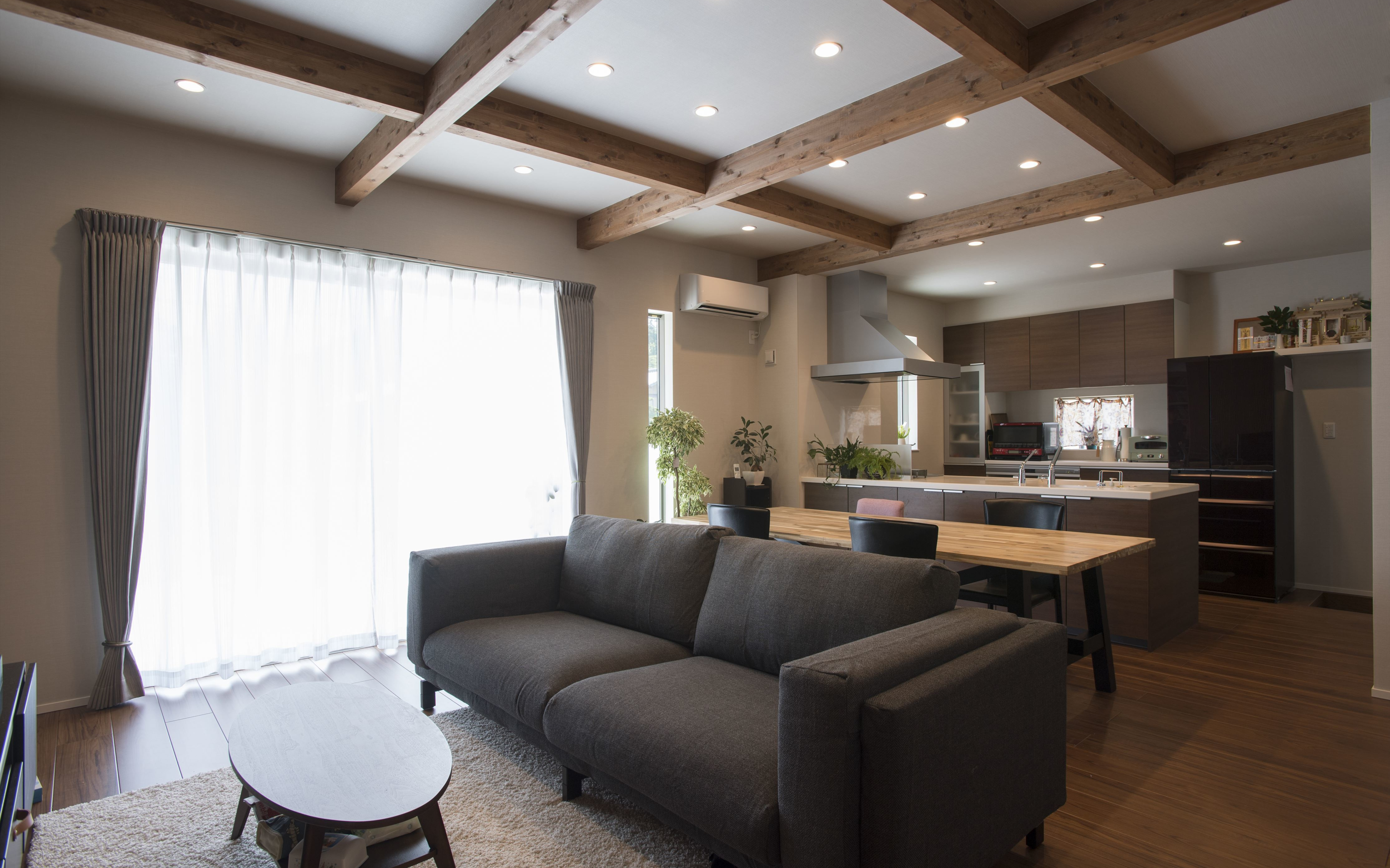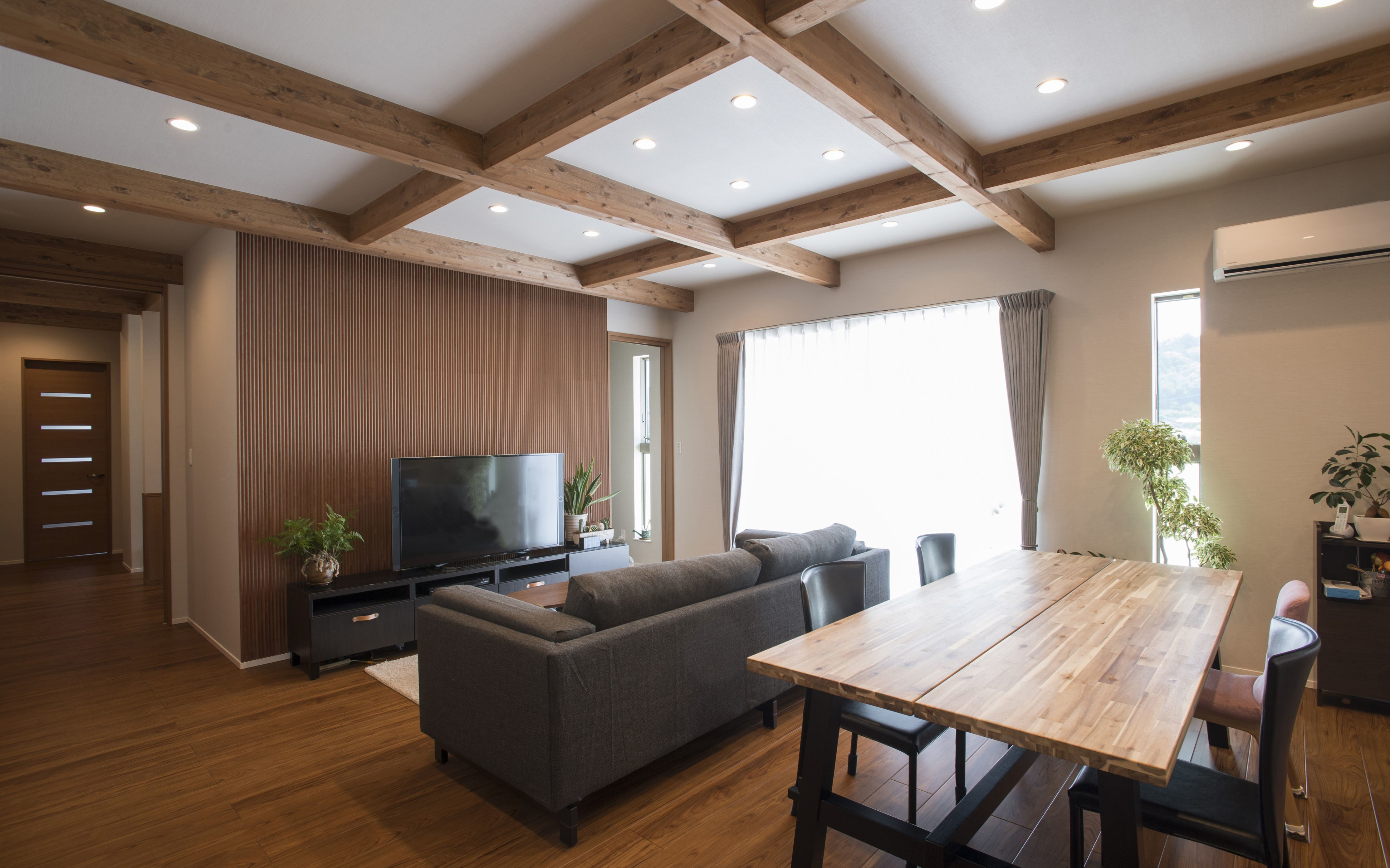室内に入ると木目が美しい梁が見える天井が開放感をあたえます。